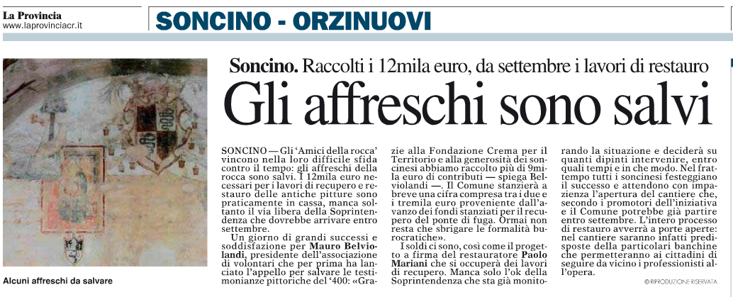 siamo molto grati al giornale La Provincia per l’attenzione che offre alle nostre iniziative, mostrando in tal modo la sensibilità del quotidiano alla conservazione del nostro grande patrimonio storico e architettonico… ma non c’è troppo da compiacersi, perchè le cose da fare sono tante e urgenti, ad esempio a partire proprio dagli affreschi: al via della Sovrintendenza, i lavori inizieranno senz’altro e, dice bene La Provincia, gli affreschi saranno salvi; in realtà le cifre raggiunte non coprono l’IVA e neppure le impalcature che saranno necessarie… ma è certo che proseguendo la campagna delle offerte con l’iniziative dei nomi sui “mattoncini” degli affreschi anche la residua parte di finanziamento verrà senz’altro coperta. (si ricorda che le ricevute sia delle donazioni per gli affreschi che delle tessere sono da ritirare dalla nostra segretaria Mary Brocchetti presso ufficio della Ass. Pro Loco Soncino (ex filanda Meroni) previo contatto telefonico al numero 348.7932155 – in ogni caso, visto che pochi l’hanno fatto, aspettiamo ancora un po’ e poi scannerizzeremo tutte le ricevute e le invieremo via mail a ciascun socio/donatore) .