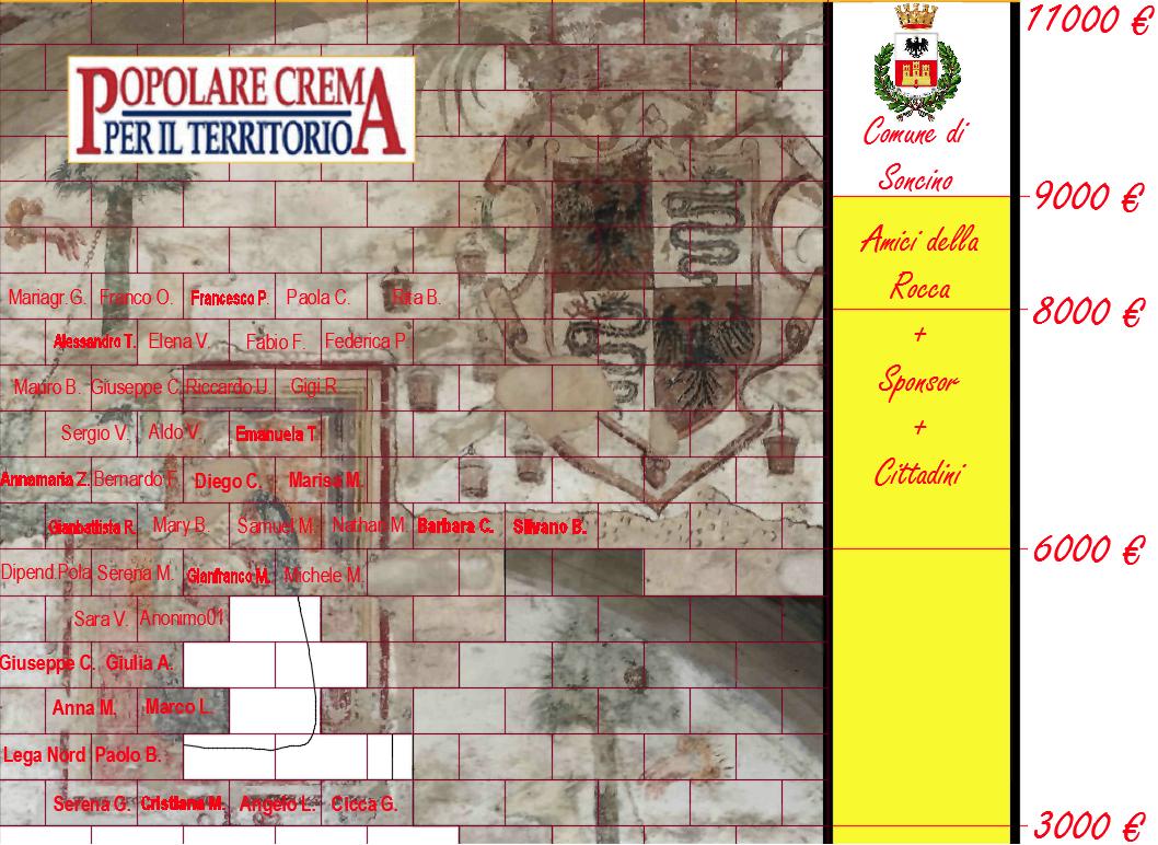 Molti soncinesi hanno dato il loro contributo al finanziamento, e in questi giorni saranno avvisati uno per uno per avere il permesso di incidere il loro nome e cognome (senza assenso scriveremo solo il nome) sui tasselli di un ideale grande affresco, che verrà apposto contro la recinzione del cantiere, al primo piano della torre: già ho avuto modo di dire che il concetto di anonimato in questo caso non ha molto senso, anzi, noi riteniamo che sia una buona occasione per tutti di testimoniare la propria attiva presenza a salvaguardia di valori che vogliamo salvaguardare e trasmettere.