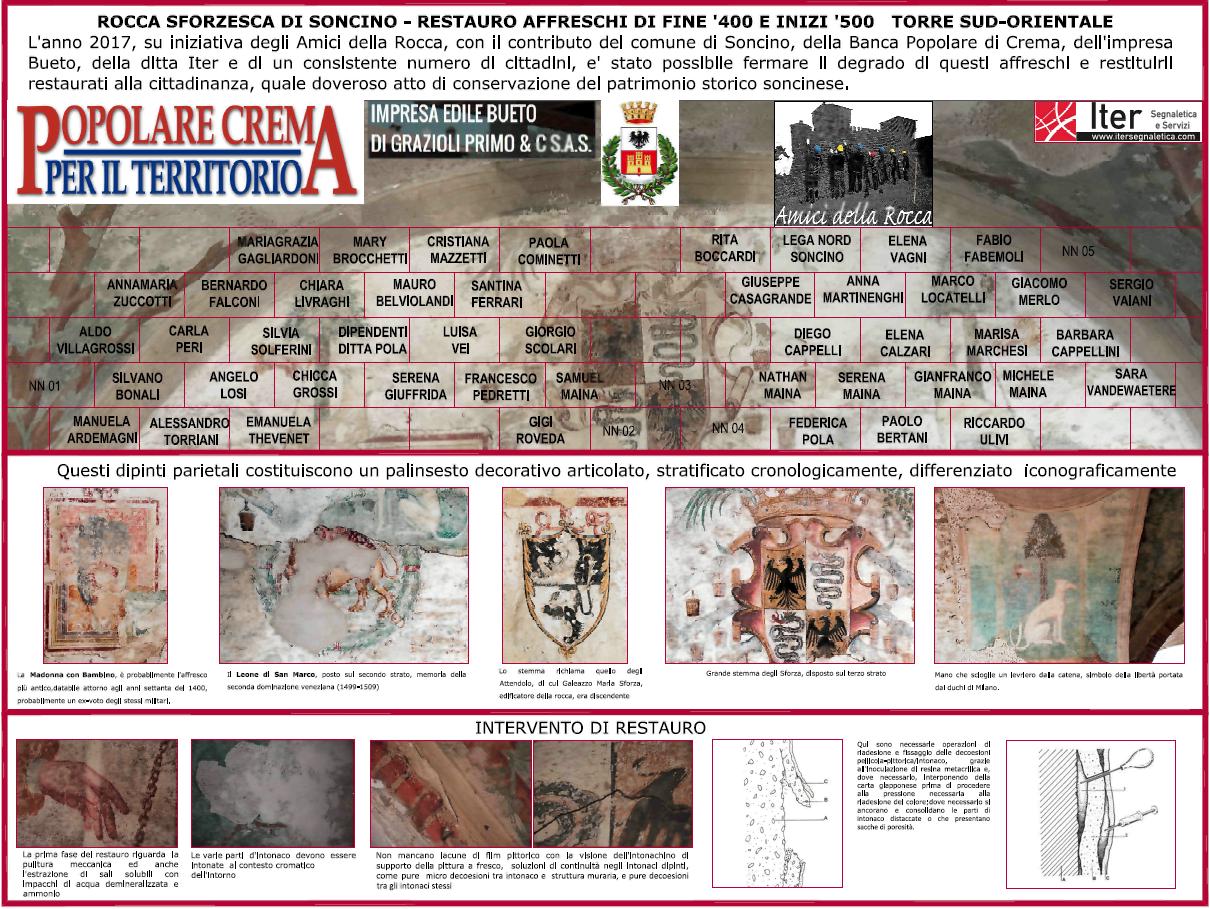 Un grande tabellone di 2m x 1,5m verrà installato ai piedi del ponteggio: riporterà tutti i nominativi di coloro che hanno direttamente contribuito al finanziamento dell’opera; saranno anche riportate alcune notizie sugli affreschi e verrà pure illustrata sinteticamente la tecnica di restauro utilizzata