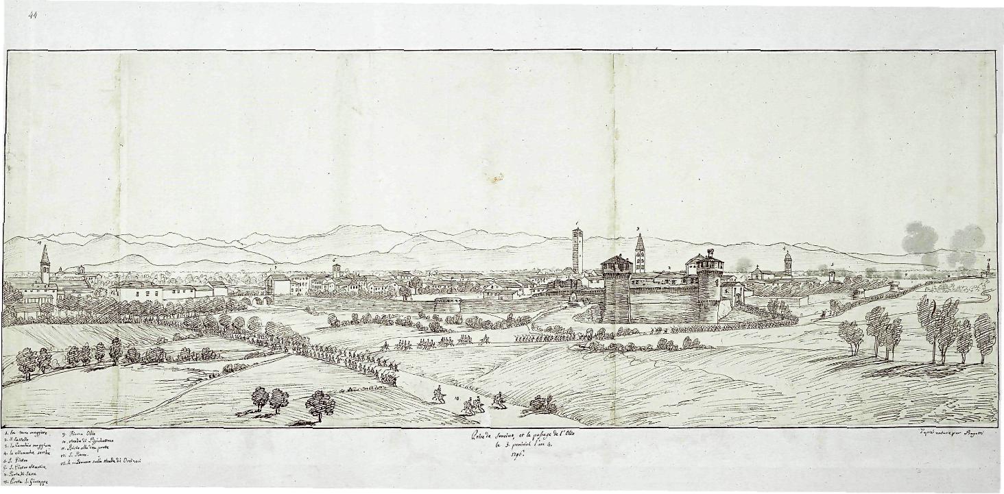 …ma noi siamo riusciti a scovare l’unico esemplare, disegnato a matita (di cui si intravedono alcuni tratti) e ripassato a “penna bruna”, con tanto di annotazioni esplicative autografe; si tratta dell’originario capostipite, che ha poi dato vita a un complesso ciclo realizzativo, con stupendi Tableaux acquerellati che fecero da base per le incisioni a bulino su rame, realizzate al “dépôt Général de la guerre” presso Parigi; anzi, più che scovarlo, ci è arrivato dritto dritto in casa: si tratta della copia del disegno originale di Giuseppe Pietro Bagetti , al seguito dell’armata francese che il 24 maggio del 1796 si apprestava ad occupare Soncino e ad attraversare l’Oglio.