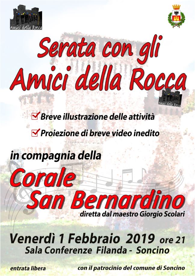 Anche quest’anno sarà la Corale San Bernardino ad allietare la serata di venerdì 01/02/2019, alle 21, sala delle conferenze, in filanda… come al solito saranno brani allegri, intonati al clima festoso per l’illustrazione delle non poche iniziative che il nostro gruppo ha saputo già concretizzare, ma anche progettare per il prossimo futuro; la tastiera del maestro Giorgio Scolari, e la bravura di tre abili musicisti al contrabbasso, al flauto traverso e al clarinetto, renderanno ancor più vivaci le interpretazioni del nostro storico coro.
