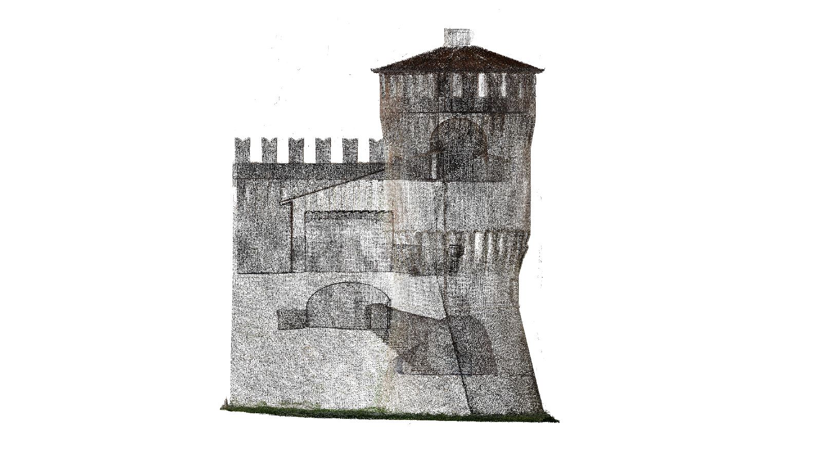 Da queste nuvole potremo estrarre qualunque informazione geometrica della torre cilindrica della nostra rocca, piante ad ogni piano, qualunque sezione, come fosse un fedele modello che riproduce con precisione assoluta ogni particolare, ogni stanza, ogni volume, perfino le più piccole fessurazioni….