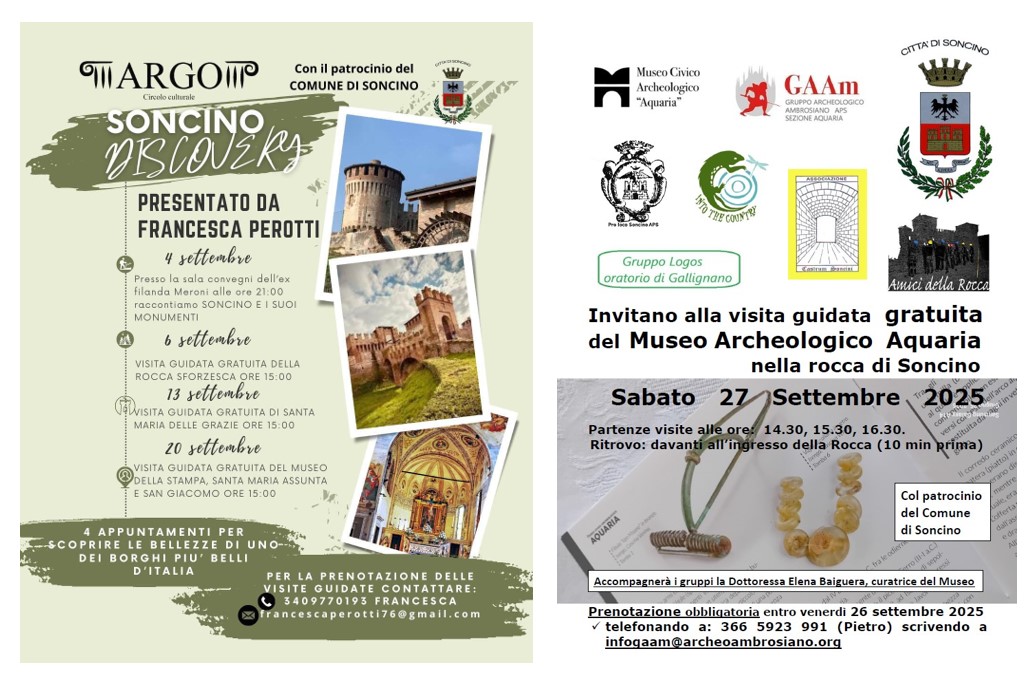 Con molto piacere segnaliamo due iniziative molto interessanti proposte da AQUARIA (sezione soncinese del gruppo archeologico milanese GAAM) e dalla rinnovata associazione ARGO di Soncino.