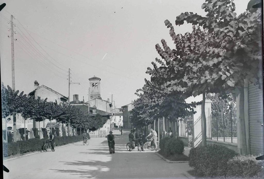 Osservando la parte destra  possiamo affermare che sia stata scattata prima del 1958: infatti si intravede la saracinesca del garage delle corriere Margiotta (e questa la ricordiamo quasi tutti, perchè demolita solo una ventina di anni fa); ma subito dopo, tra il garage e l’attuale muro dell’immobiliare, non appare l’imbocco di via Stazzi; questa via è stata realizzata per servire, da un lato, la casa del noto imprenditore edile Pierino Cavalli (lato est di via Stazzi) e dall’altro le villette sul lato ovest, che cominciarono ad essere edificate nel 1958 (informazioni Teresa Businaro e Bibe Reali). Fino ad allora tutta l’area era occupata da un grande campo di proprietà Margiotta, e si accedeva da via Padre Zanardi attraverso un cancello privato, giusto per poter raggiungere l’unica abitazione in cui viveva la famiglia Margiotta; nella foto si nota chiaramente la proiezione dell’ombra dei cancelli semiaperti, proprio dove ora ha inizio via Stazzi.