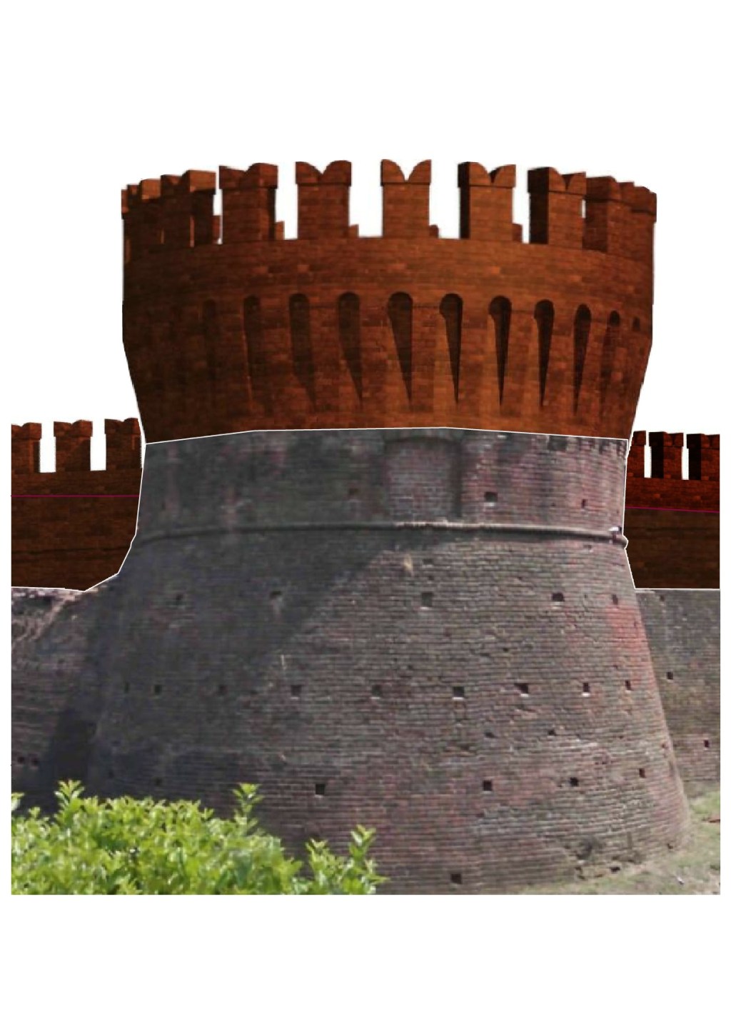 Ed ecco dunque la possibile audace sequenza dei lavori:  dopo aver tolto la merlatura del torrione, mantenendo i piombatoi, viene rinforzato il tutto,   innalzato la torre fino a quota degli spalti della rocca, ricreato una nuova corona di piombatoi merlati… .