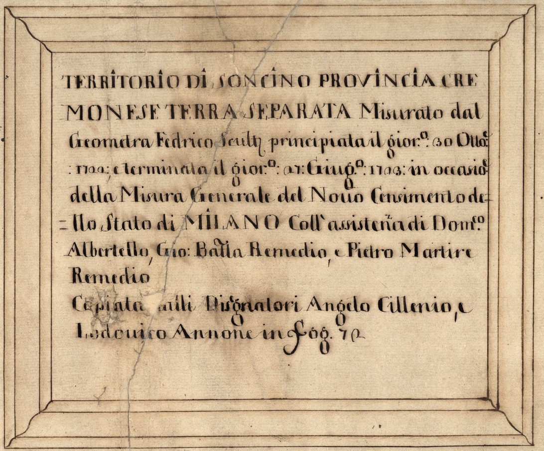 Inoltre la Soncino di quell’epoca può essere considerata molto simile a quella del periodo aureo. Neppure il giovane geometra Federico Shultz che, il 30 ottobre 1722, si apprestò a dirigere il gruppo di agrimensori che in meno di 8 mesi portò a termine questo importantissimo lavoro, poteva rendersi conto che stava consegnando alla storia non solo un indispensabile strumento fiscale, ma anche il plastico più spettacolare e rappresentativo di Soncino fra i tanti secoli della sua millenaria storia.